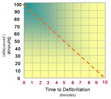Rates of survival escalate from 5% to over 65% where AED response is prompt and within 2-4 minutes. |